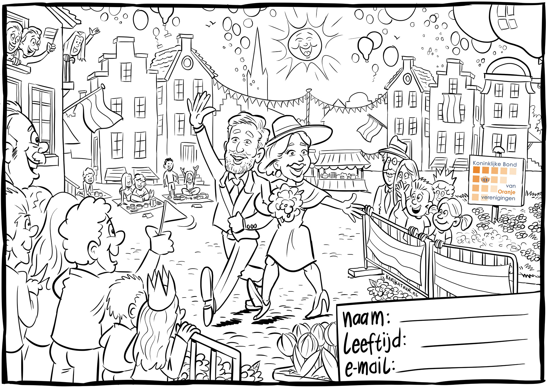 Print deze kleurplaat uit en kleuren maar. Lever de kleurplaat op Koningsdag in bij de Oranjecomité kraam in de tent en ontvang een leuke verrassing! Geen printer, geen nood, de tekening is, vanaf woensdag 17 april, gratis af te halen bij de Bibliotheek in het Raadhuis, Markt Schijndel.